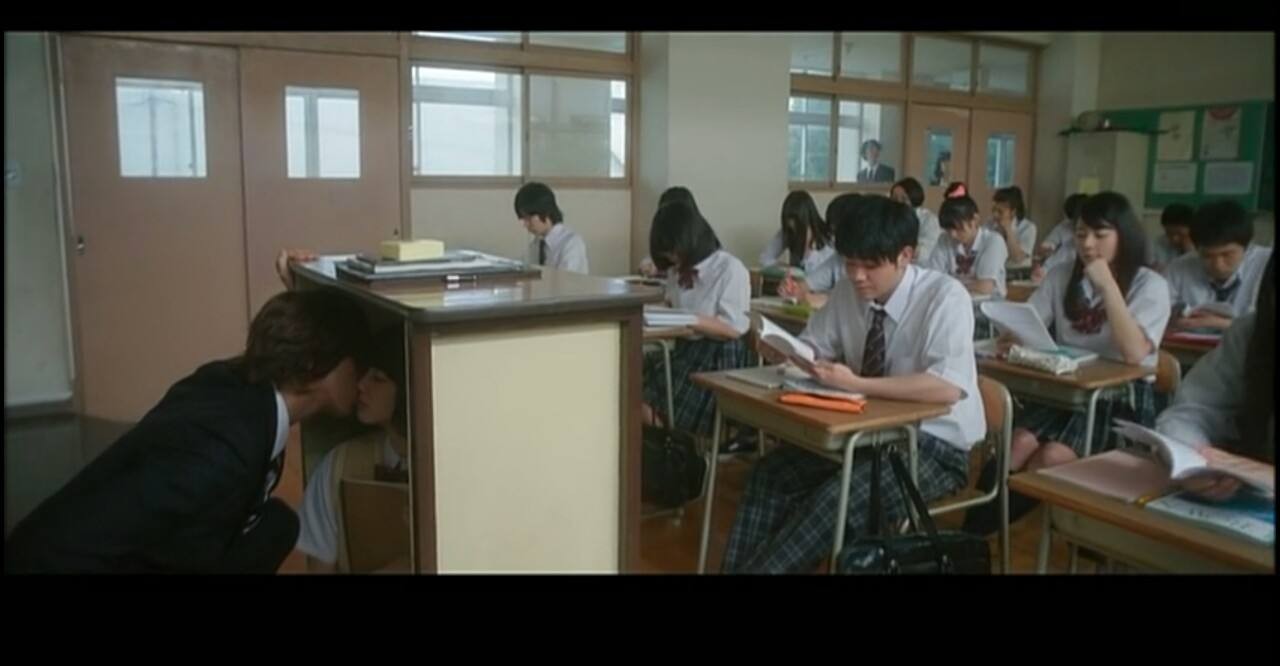 最精彩的一幕就是女主躲在讲台底下,男主假装笔掉了,去亲女主。太经典了这一幕。
