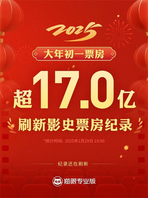 据猫眼专业版数据,截至1月29日20时30,2025年大年初一总票房已达17.42亿元,超过2021年大年初一票房成绩,刷新中国影史单日票房纪录。