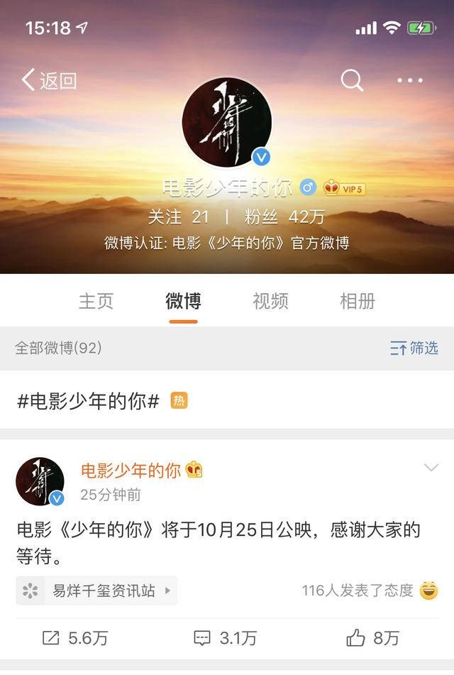10月22日,《少年的你》重新定档10月25日,官宣离上映仅三天。