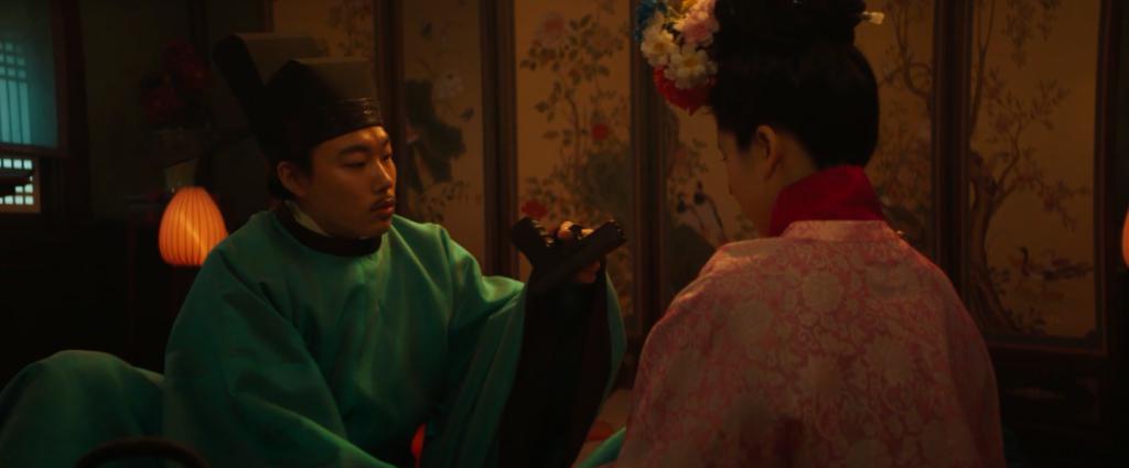 女孩要靠神剑回到未来,男孩则想拿神剑换取钱财。他们在一场婚宴上相遇,女孩假扮成新娘潜入,男孩则装成新郎进府。上述提到的,新娘子身上掉下来一把枪,便是两人洞房花烛时的桥段。
