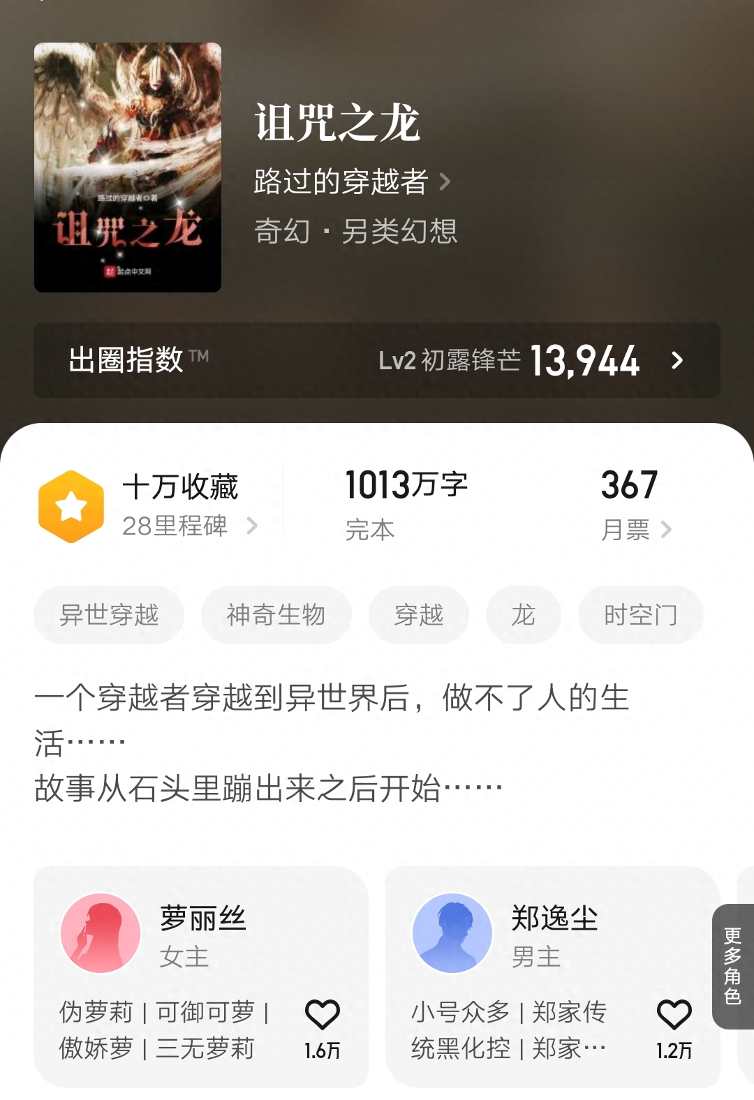 ④路过的穿越者的《诅咒之龙》在上周完结了,这本小说从2017年5月上线,写了五年多,破了一千万字,成绩虽然一般,但也有不少读者挺喜欢的。