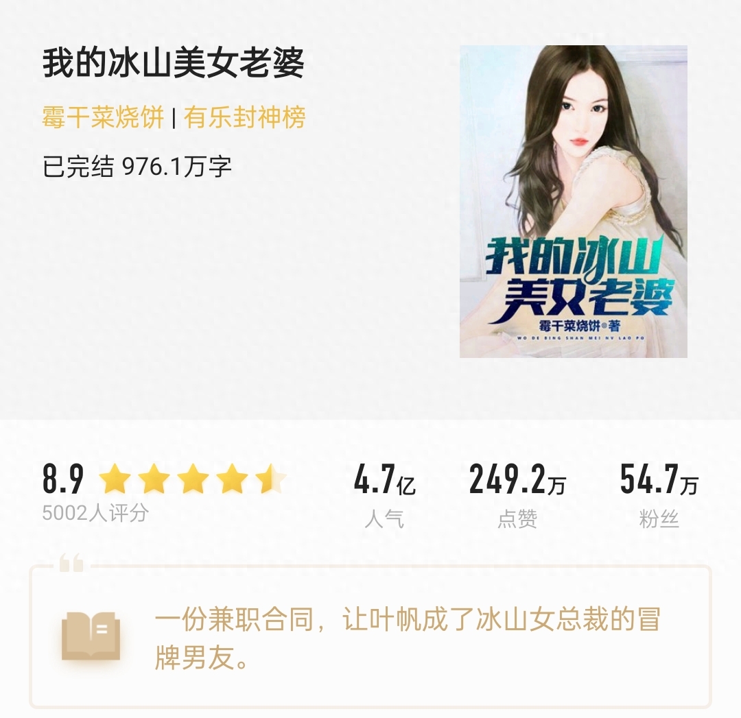 在微博看到这位无线文大神通告了自己新书《重生之都市剑尊》上线的消息,而他的老书《我的冰山美女老婆》也正式完结了。