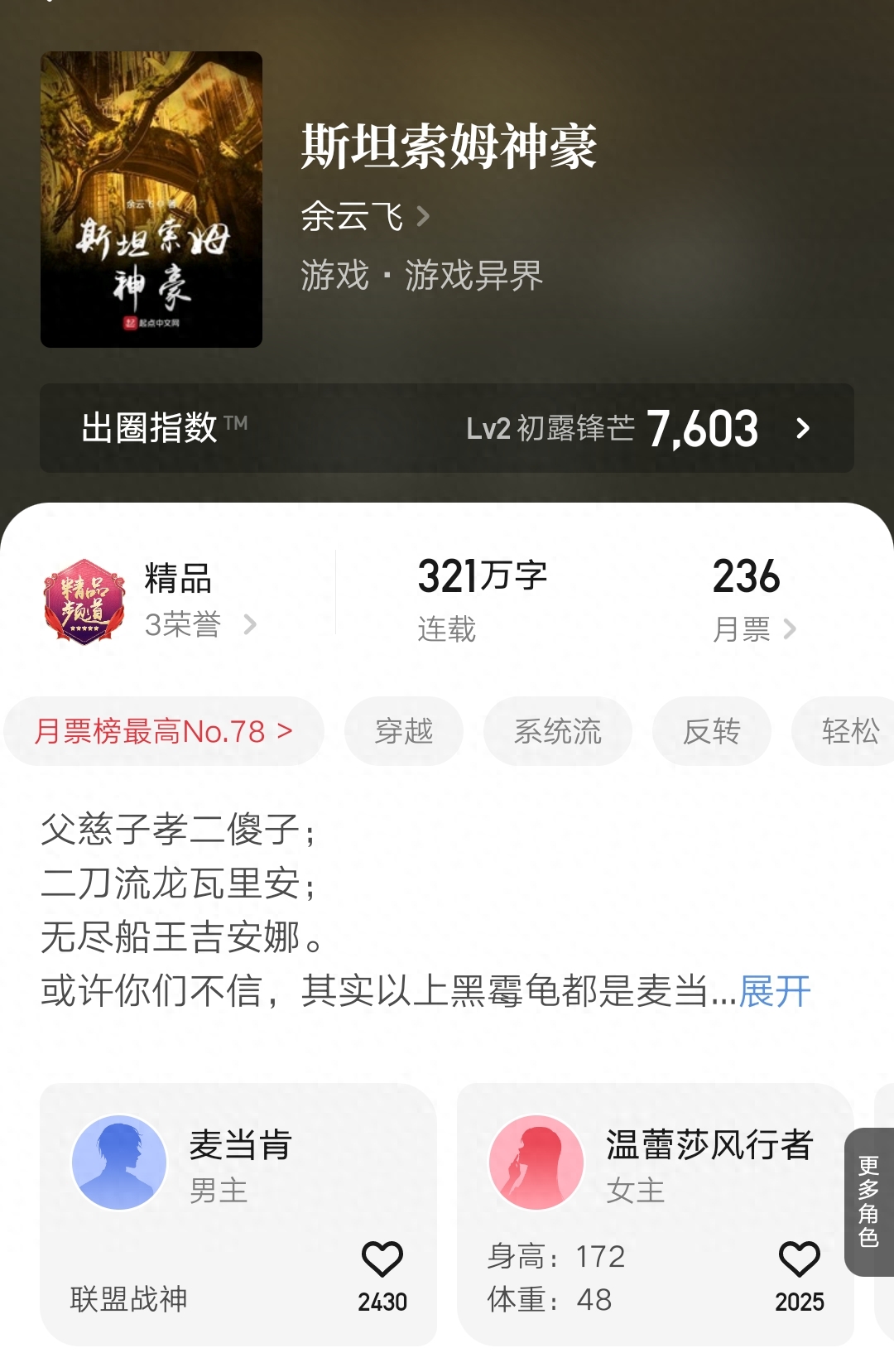 另外作品完结的还有余云飞的《斯坦索姆神豪》,这似乎是本魔兽世界的同人文,不过我也没玩过这游戏,并不了解是否是这个题材,有兴趣的可以关注一下。