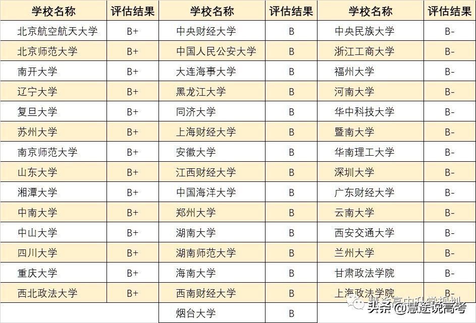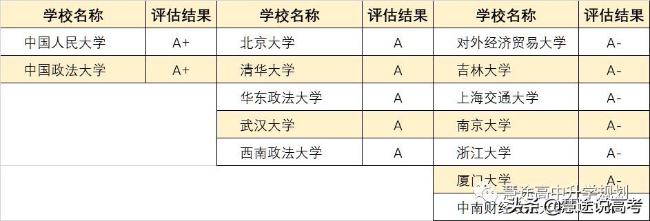 A-级以上的14所院校中,有9所“一流大学建设A类高校”,有3所“一流学科建设高校”(中国政法大学、对外经济贸易大学和中南财经政法大学),仅2所普通一本院校:华东政法大学和西南政法大学。
