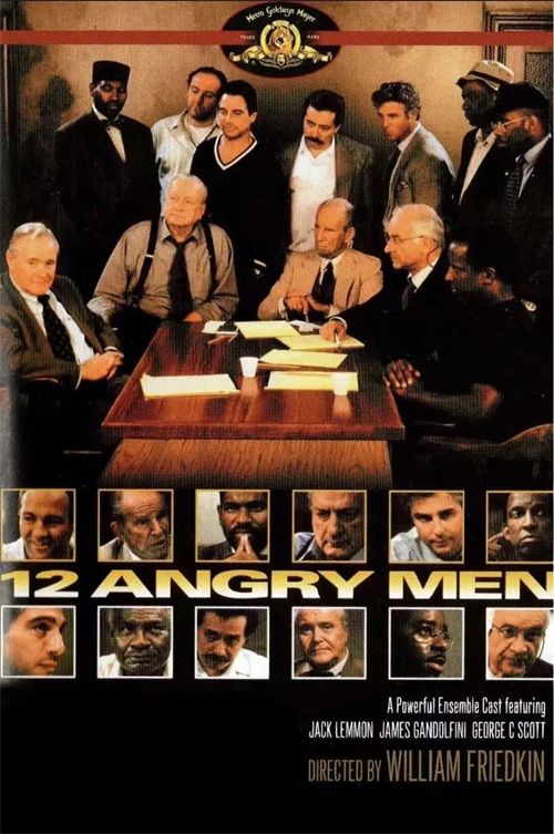《十二怒汉》主要以一个18岁少年被怀疑谋杀生父的案件展开,12位不同职业的人依据法律组成陪审团,判断少年有罪与否,进行投票来决定他的生死。从起初11票有罪,1票无罪到最后全员无罪通过,中间经历了取证物件,案件推理,成员争执,最终达成一致。
