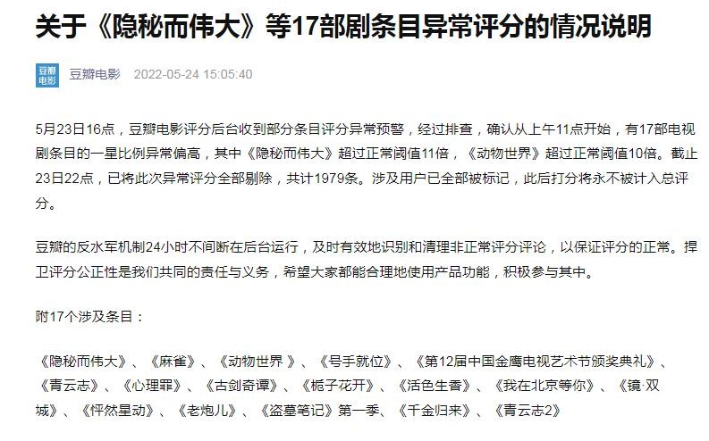 5月24日下午,豆瓣官方豆瓣电影发布情况说明,从5月23日16点,豆瓣后台收到了部分条目异常警报,排查后发现从上午11点起,有11部电视剧条目的一星比例异常增高,其中《隐秘而伟大》超过正常阈值11倍,《动物世界》超过正常阈值10倍。豆瓣官方目前已经将此次异常评分全部剔除,本次异常评分涉及了17个影视剧条目,均为演员李易峰主演或参演的作品,甚至还包括了其出席的金鹰电视艺术节颁奖典礼。异常情况最为严重的两部剧《隐秘而伟大》《动物世界》均为李易峰演艺生涯中评分较高、口碑较好的代表性作品。