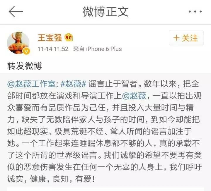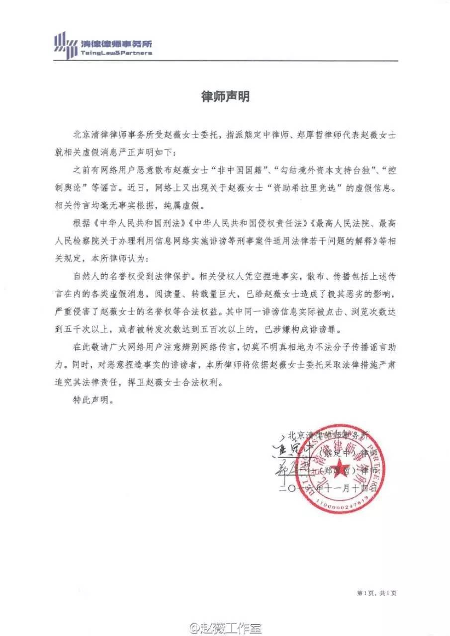 11月14日,赵薇工作室发布声明对于谣言予以回应,表明“真的承载不了这个所谓的世界级谣言”,并将追究其法律责任。微博发出后,赵薇圈中好友黄晓明、何炅、张歆艺、孙俪、陈思诚、张静初等,都纷纷发微博支持赵薇。
