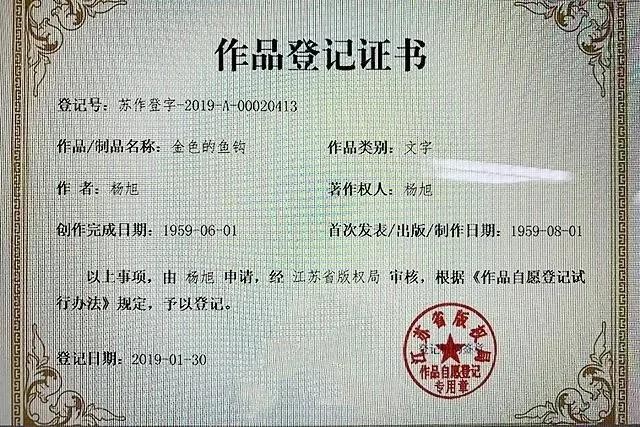 由于历史原因,《金色的鱼钩》一文后续被用作小学教辅课文中时,署名作者为陆定一。江苏新高的律师事务所的代理律师,通过前期证据收集,问题分析,代为申请版权登记,最终为作者杨旭成功申请取得版权登记证书。在法律程序上认定杨旭是唯一作者。
