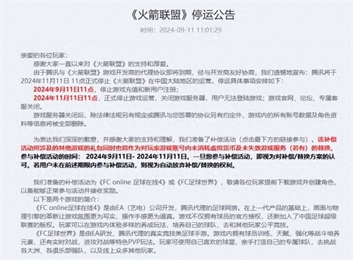 公告指出,由于腾讯与《火箭联盟》游戏开发商的代理协议即将到期,腾讯将于2024年11月11日11点正式停止《火箭联盟》在中国大陆地区的运营。
