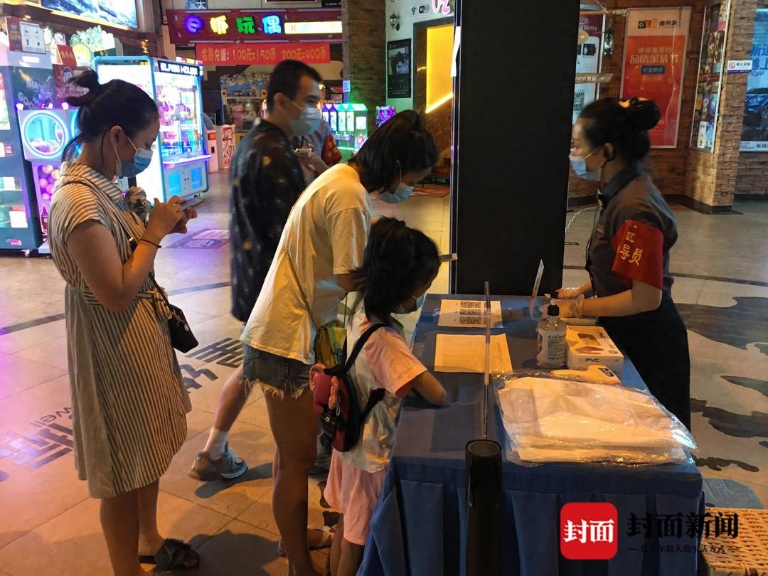 7月24日上午9时50分,在自贡星维国际电影城南湖店,前来观看自贡首场电影《哪吒之魔童降世》的观众,戴着口罩经过体温检测,在检票口检票入场。当天,自贡6家电影院迎来复工后第一场电影放映。