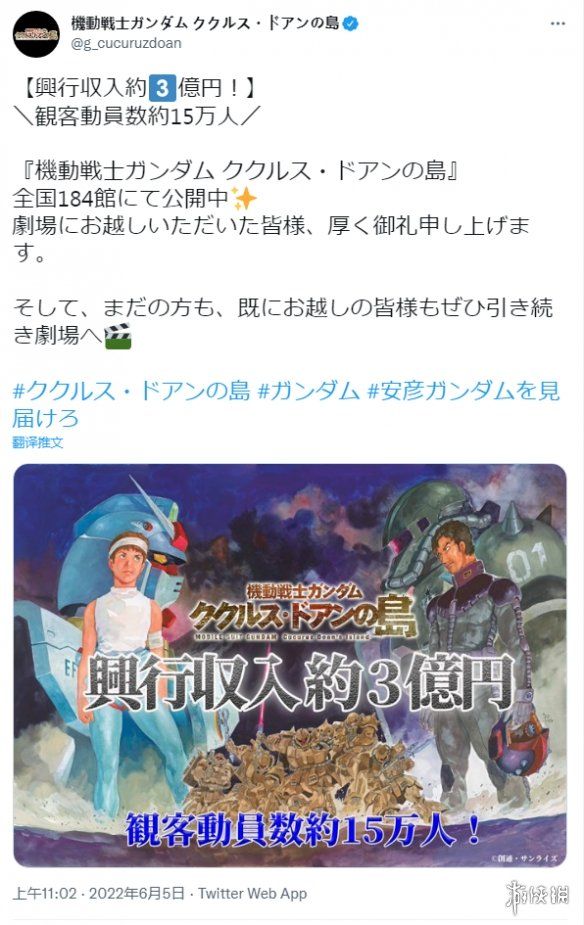 根据影片的推特账号,《机动战士高达:库库鲁斯·杜安之岛》前两天票房达约3亿日元,约合1500万元人民币。这部电影目前正在日本全国184家影院上映。