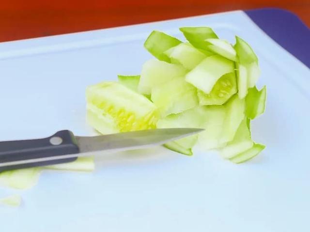 2、把不锈钢削皮刀抵在其中一个切面上,浅浅地划入黄瓜皮下,转圈切,直到划到离黄瓜柄1.25厘米左右,这时黄瓜的绿衣应呈丝带状