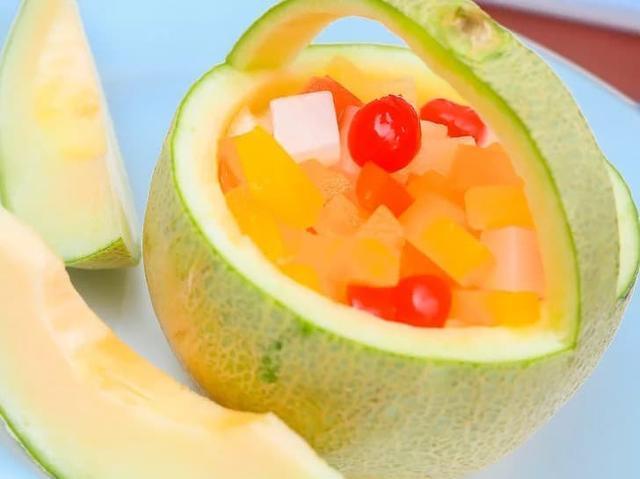 可以在哈密瓜碗底戳几个小孔,再放在盘中,这样可以滤出水果沙拉的多余水分