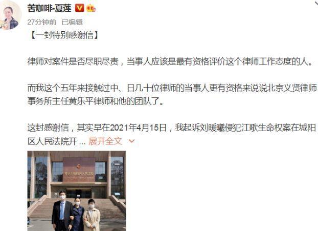 最后,江歌的妈妈在社交平台发文,感谢帮助他的律师团队,江秋莲称“赔偿金额并不重要,关键是用法律还原了我江歌被害的真相!”