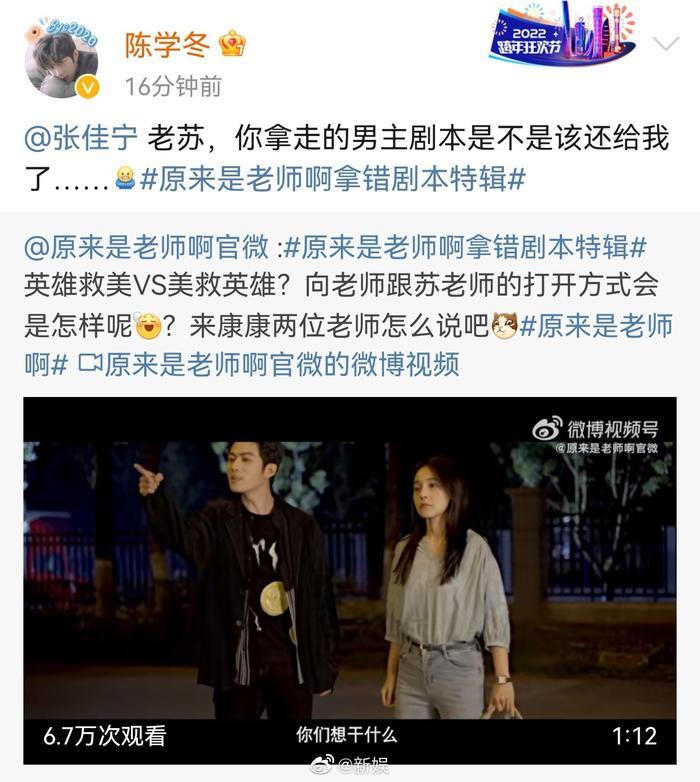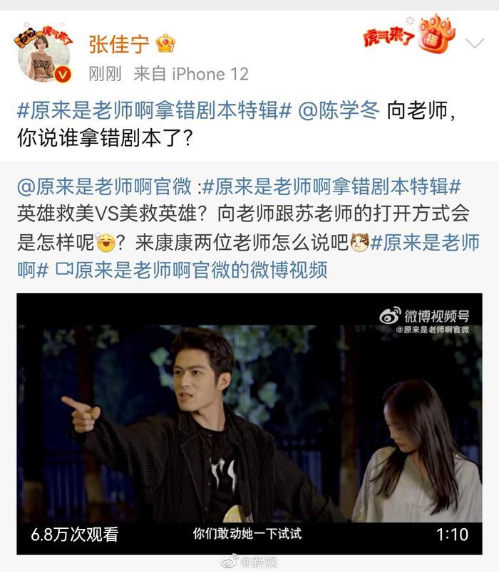 剧里没有英雄救美,只有美救英雄,怪不得陈学冬让张佳宁把剧本还他。已经预感到他俩剧里的互动肯定又甜又好笑,《原来是老师啊!》快点播!#陈学冬让张佳宁把男主剧本还他#