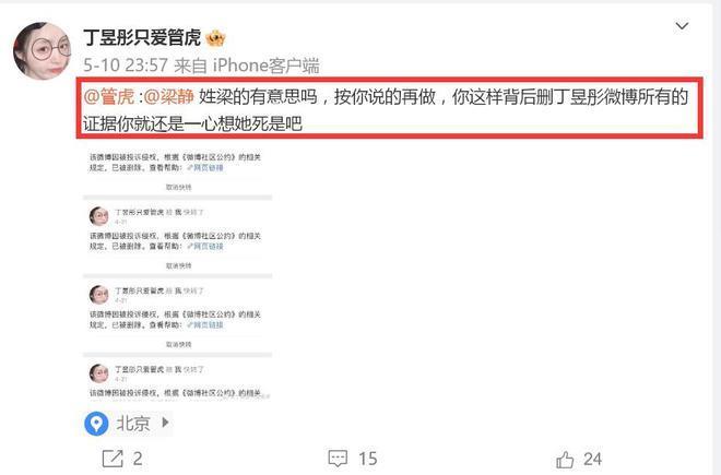 此外,丁昱彤的很多微博也都被投诉删除,气得丁昱彤只能在微博中再次喊话梁静要逼死她。