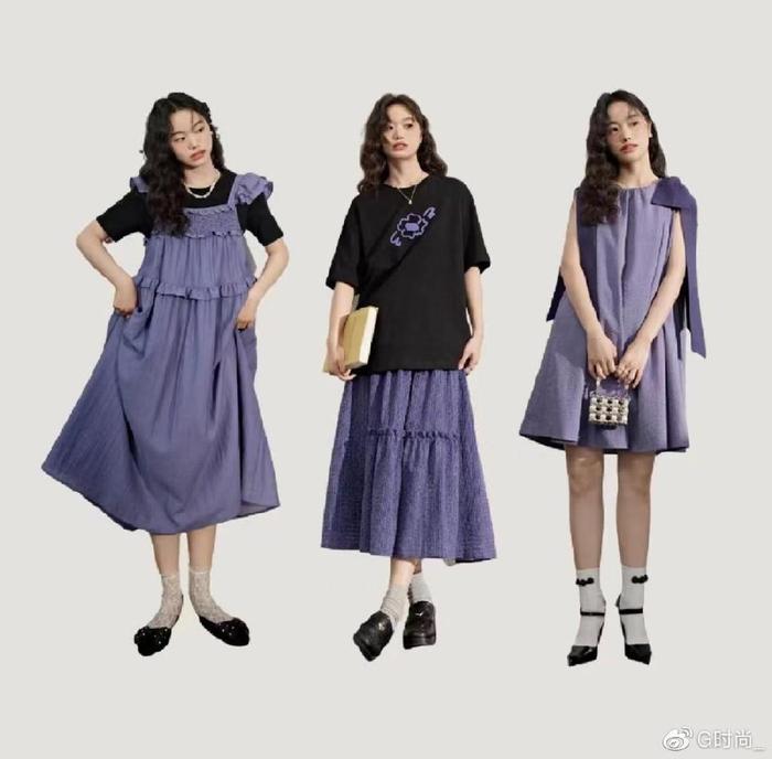 紫色系的小飞袖吊带裙简约又优雅,裙身整个都是非常宽松的,所以穿在身上也会比较显瘦,微风吹来,随风摆动也是很有仙气儿呢,单穿很清凉,内搭黑色的T恤衫则少女感爆棚呢!