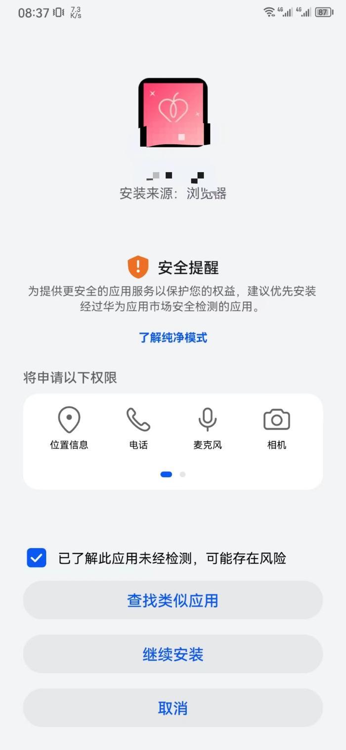 为确认该卡片信息,笔者发扫开二维码,通过浏览器跳转,能够下载一款APP。下载页面内容露骨、少儿不宜。而其准备安装时,就被手机提示“可能存在风险”。之后笔者便不再操作下去。