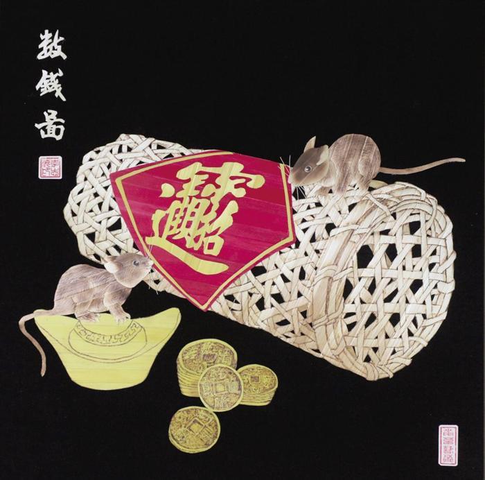 制作好的麦秆画作品《数钱图》