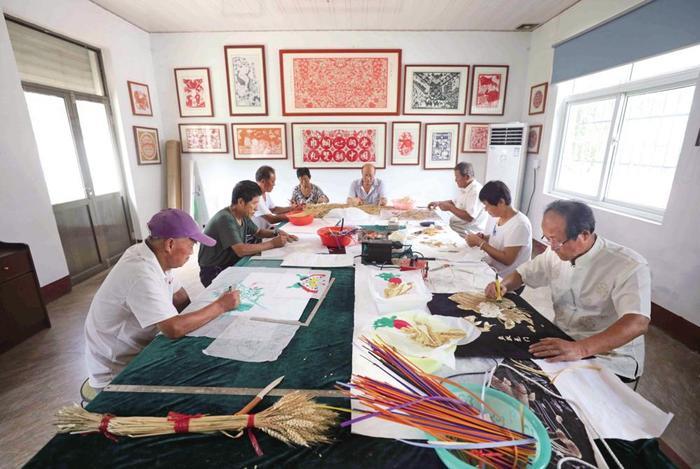 传承人李志海(右一)带领村民制作麦秆画