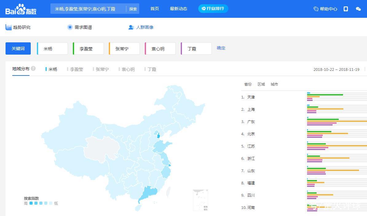 看下面两张关注人群截屏,对米杨的关注天津球迷排第一、上海球迷排第二,广东,北京,江苏分列3-5位;而对李盈莹的关注天津球迷排第一,广东,北京,江苏分列2-4位,上海仅列第十位。查看袁心玥、张常宁、丁霞的关注人群会发现,竟然都是广东球迷排在第一位!北京,江苏等地球迷靠前!这个关注度对比说明了什么?说明广东、江苏、北京球迷较多,属于正常关注范畴;而米杨出自天津涉及利害关系,天津球迷才会格外关注她!