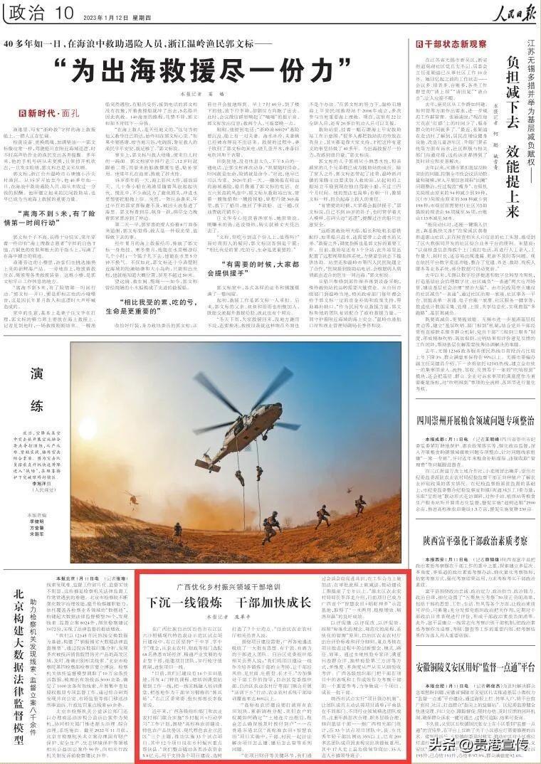 1月12日,《人民日报》刊登《广西优化乡村振兴领域干部培训 下沉一线锻炼 干部加快成长》,报道贵港市实施“乡村振兴+行动学习”工作成效亮点。