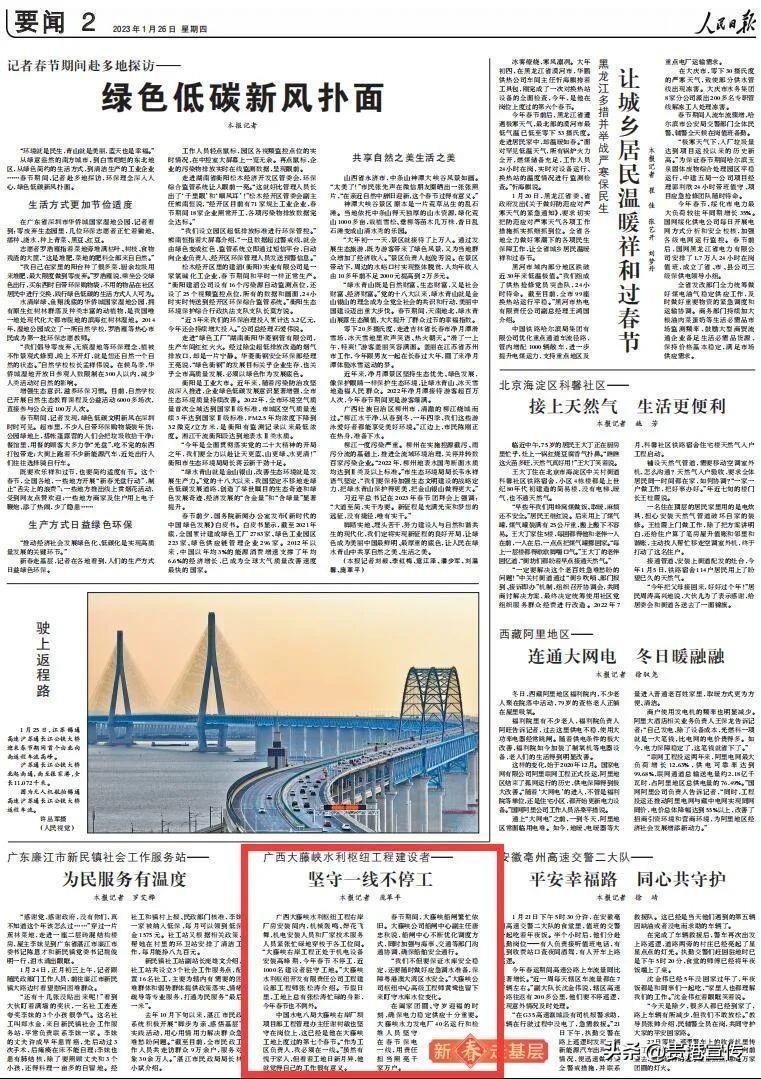 1月26日,《人民日报》刊登《广西大藤峡水利枢纽工程建设者——坚守一线不停工》,报道位于桂平市的国家重大水利工程大藤峡水利枢纽工程建设情况。