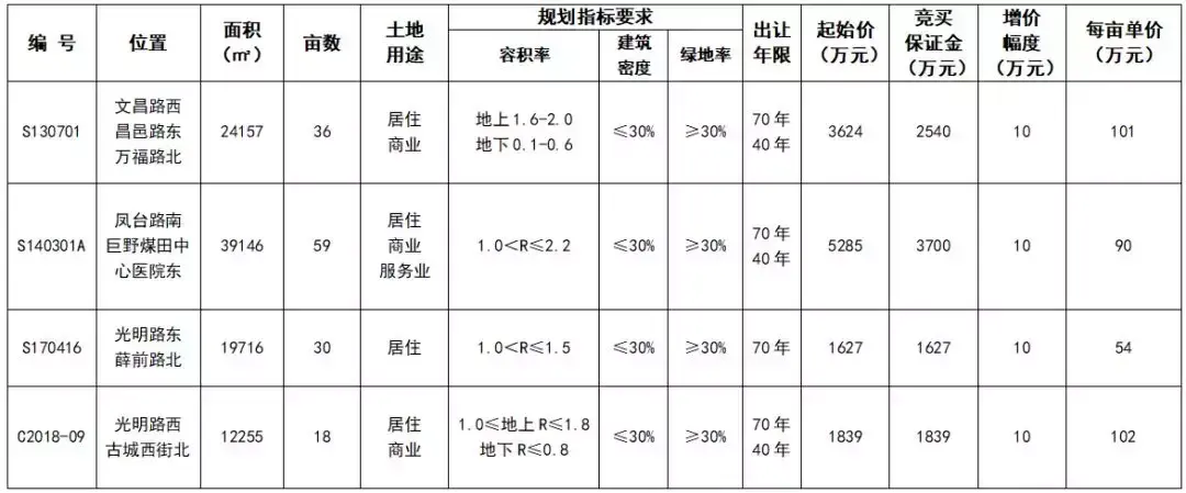 巨野县在11月份-12月份期间挂牌出让了4块居住商服土地,我们通过地块亩数、每亩最低单价和土地最高容积换算出了最低的楼面价格。