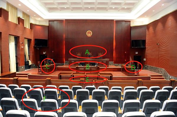 1、A处是法官的座位,一般都是3个座椅,中间的一个比两边的两个高些。独任制审判时,只有一个法官,坐在A中间的座椅上。合议制审判时,三个审判人员,审判长坐中间,其他两个法官(或人民陪审员)分坐两边。