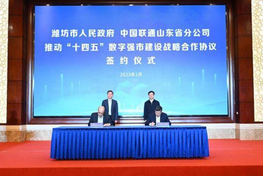 中国山东网-感知山东2月15日讯(中国山东网记者 曹涛 通讯员 张安琪)2月9日,潍坊市人民政府与中国联通山东省分公司签署了战略合作协议。山东联通将潍坊市作为主要战略合作城市和业务发展重点支持区域,积极发挥新一代信息基础设施建设者和运营者的“先行军”作用,助力加快建设新时代社会主义现代化强市,助推潍坊经济社会实现高质量发展。