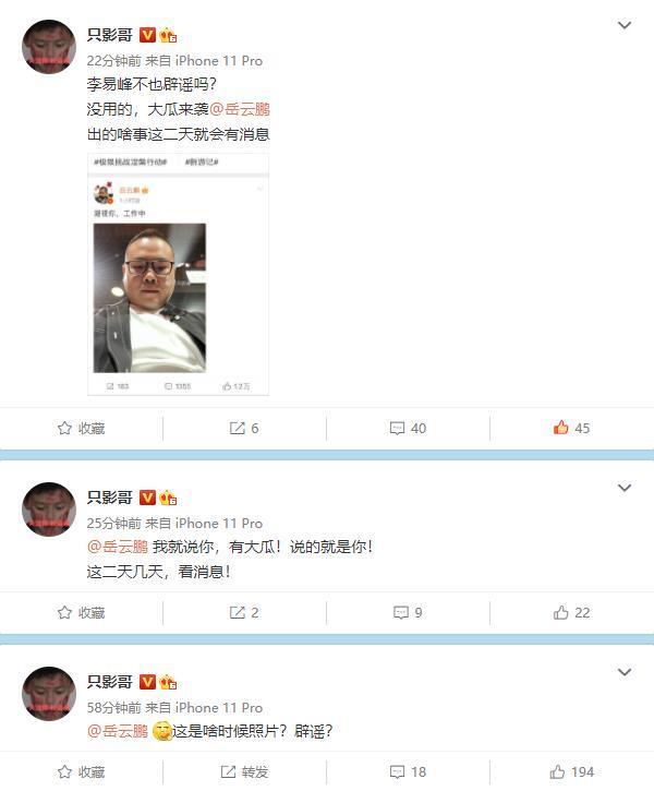 大V@岳云鹏:“@岳云鹏 [吃瓜]这是啥时候照片?辟谣? ”