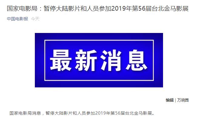 国家电影局消息,暂停大陆影片和人员参加2019年第56届台北金马影展。
