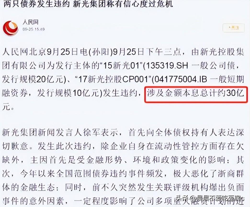 但是这个时候她的公司已经陷入了一个借新还旧的死循环,到了2018年的时候,3月份刚顶上“浙江女首富”头衔,9月份就开始“暴雷”了,这个时候公司已经是负债累累,新光集团有两笔共30亿的债务暴雷,坐实了外界关于其流动性危机的传言。