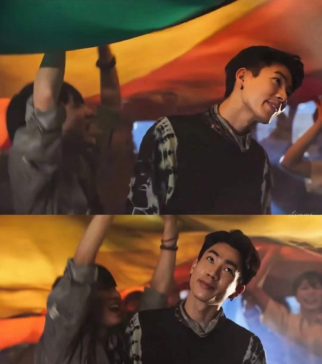 除了线下的活动,众多明星也在社交软件上表达了对“骄傲月”的支持,如出演腐剧爆火的offgun和bkpp也表达了支持。特别是今年完结的offgun主演的电视剧《not me》中有一幕white和sean在彩虹旗下的牵手的画面也在曼谷骄傲月的活动中成为现实,让人惊喜不已。或许我们可以说一些好的作品是能带来一些好的改变的。