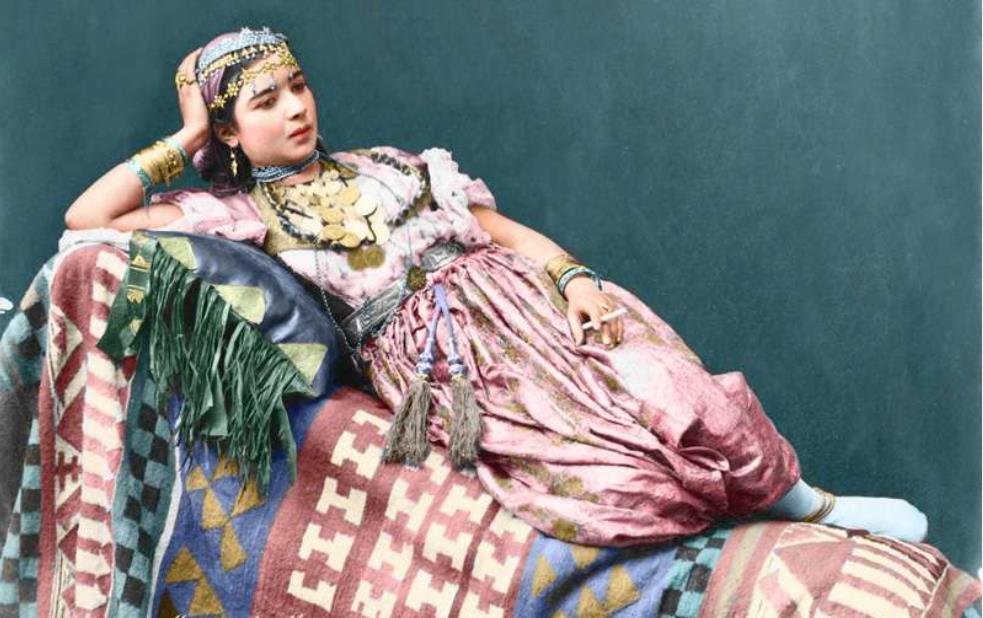 1870年代,一名阿尔及利亚摩尔女子肖像,穿戴着光鲜亮丽的传统服饰。7世纪时,伊斯兰教兴起,阿拉伯帝国逐渐扩张,8世纪后传入北非,摩尔人主要为穆斯林。这张照片是摩尔人女性,婀娜多姿,与今天一般人对伊斯兰女性的刻板印象刚好相反。