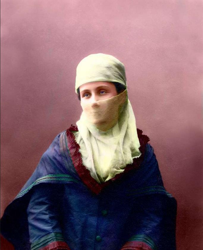 1880年代,头戴白色薄纱(土耳其语:yaşmak)的土耳其女子。当鄂图曼华丽宫廷内的王室贵族正忙着打扮自己的同时,平民百姓只思考着如何遮盖自己。不过面纱却是透明的,因此遮盖自己的方式也成为某种装饰。