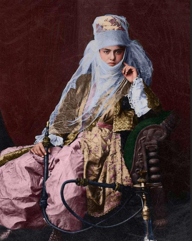 1880年代,鄂图曼帝国女子与水烟。这张照片出自著名土耳其摄影家之手,在西方人眼中成了鄂图曼帝国女性的代表,在土耳其许多旅游商店都可以看见这张照片的复制品,不过原图只是黑白的。