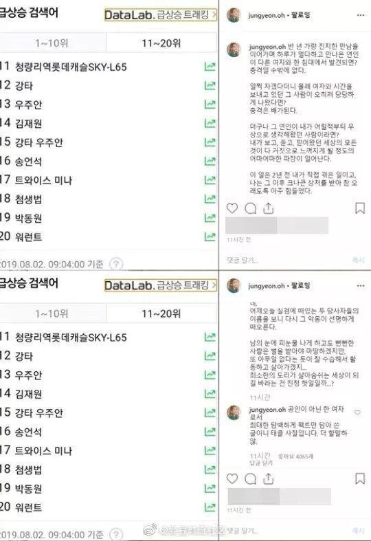 8月2日,吴静妍(徐章勋前妻)在ins上上传了安七炫和于周安在门户网站实时搜索词中的画面截图,并表示:“恋人和别的女人在一张床上被发现?这无疑是个打击。”