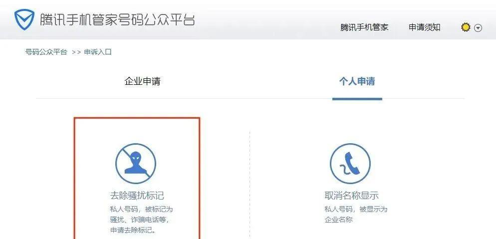 第2步:选择个人申请下的“去除骚扰标记”,点击进入下一步。