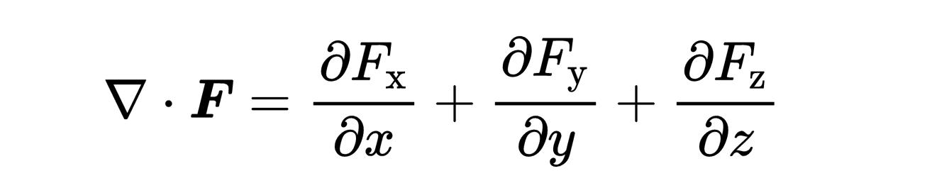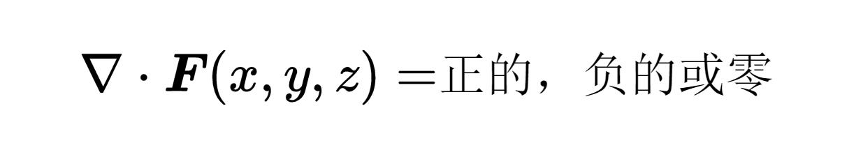 这样一个nabla算子和矢量场F之间的标量积被称为矢量场F的散度(Divergence of F)。在位置x, y, z的结果不再是一个矢量,而是一个标量,它可以是正的,负的,或者是零。