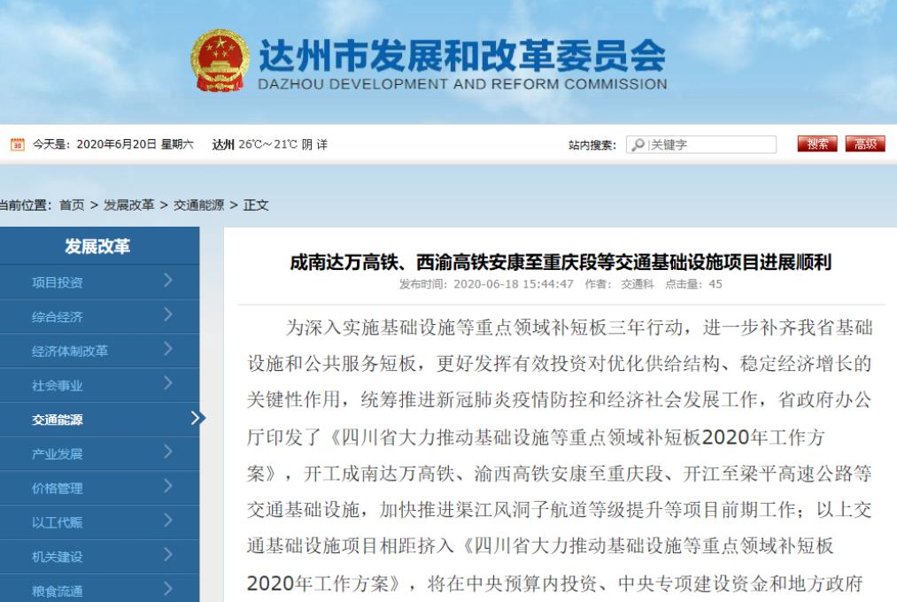 6月18日,四川省达州市发展和改革委员会官网发布《成南达万高铁、西渝高铁安康至重庆段等交通基础设施项目进展顺利》