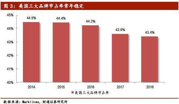 美国汽车行业格局较为稳定集中,三大车企在美国的市占率为43.4%。美国汽车市场是全球最大且最成熟的汽车市场之一,2000年美国汽车销量达阶段高点1781.2万辆,2018年销量1782.5万辆,与2000年销量基本一致。成熟稳定的市场环境下,美国品牌的格局较为稳定: