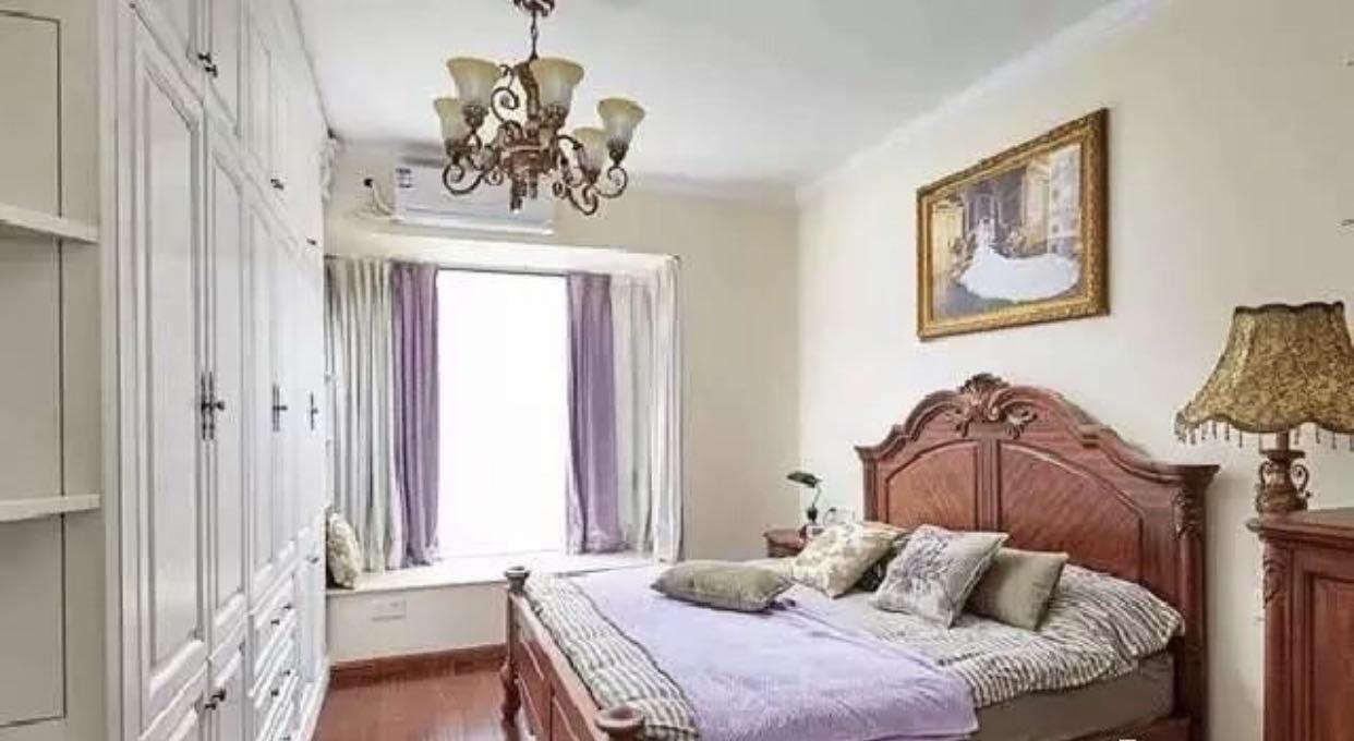 卧室里的灯具和床具的颜色和款式就更带有复古感,高大的立柜占据了一整面墙,收纳的空间非常大,整体房间的色调是白色从视觉上夸大了空间,窗帘是两层设计,卧室的地板的颜色是红棕色,电源与灯具的开关设置在床头非常的方便。