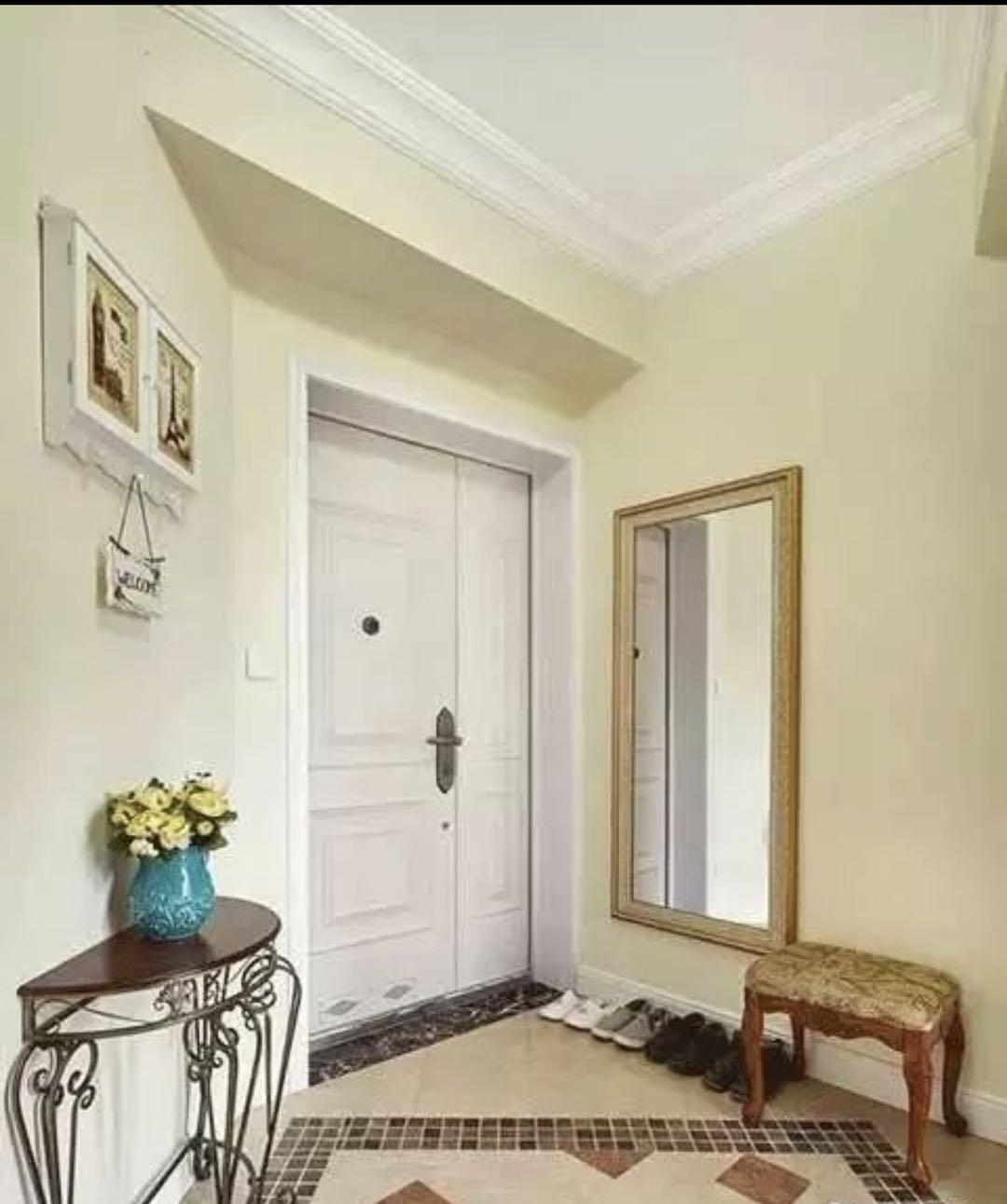房间的整体背景是以白色为主并配合着古典实木家具。首先是进门玄关处,由于没有设立鞋柜和本身自带的外扩型,所以这个玄关看起来非常宽敞。在外扩的空间安装了一个欧式风格的台子上面摆上一一个碧绿的花瓶,非常的有格调。台子上方是房间的电源总闸,并用信箱的装饰掩盖住非常的聪明,门左侧镜子的边框和换鞋凳采用的也是欧式风格如出一辙。