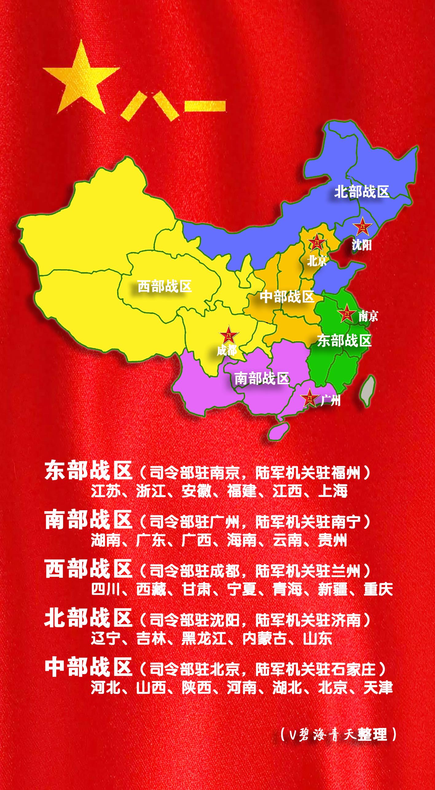 2016年2月1日,中国人民解放军原北京、沈阳、南京、成都、广州、兰州、济南军区成为历史,东部战区、南部战区、西部战区、北部战区、中部战区正式成立。