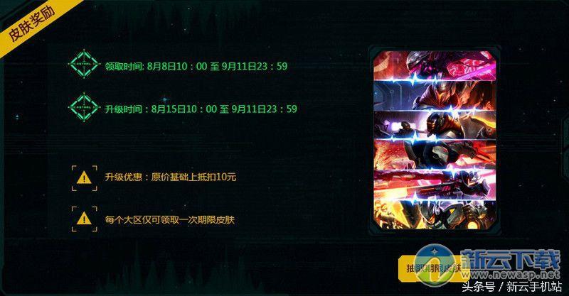 升级优惠:原价基础上抵扣10元,每个大区仅可领取一次期限皮肤