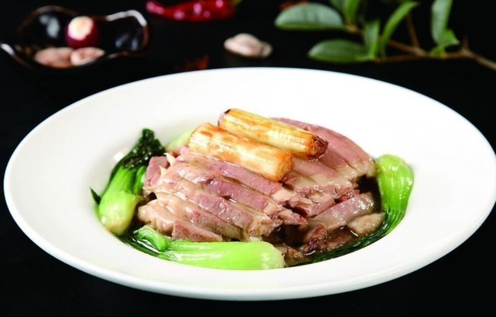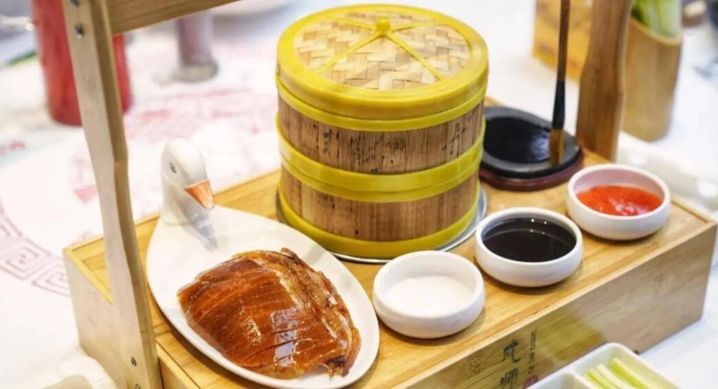烹调技法复杂,成菜后的鸭肉肥而不腻,色泽红艳明亮,鸭皮酥脆,肉质嫩爽可口,搭配甜面酱、黄瓜丝、葱丝食用,一口下去幸福感超级满足。