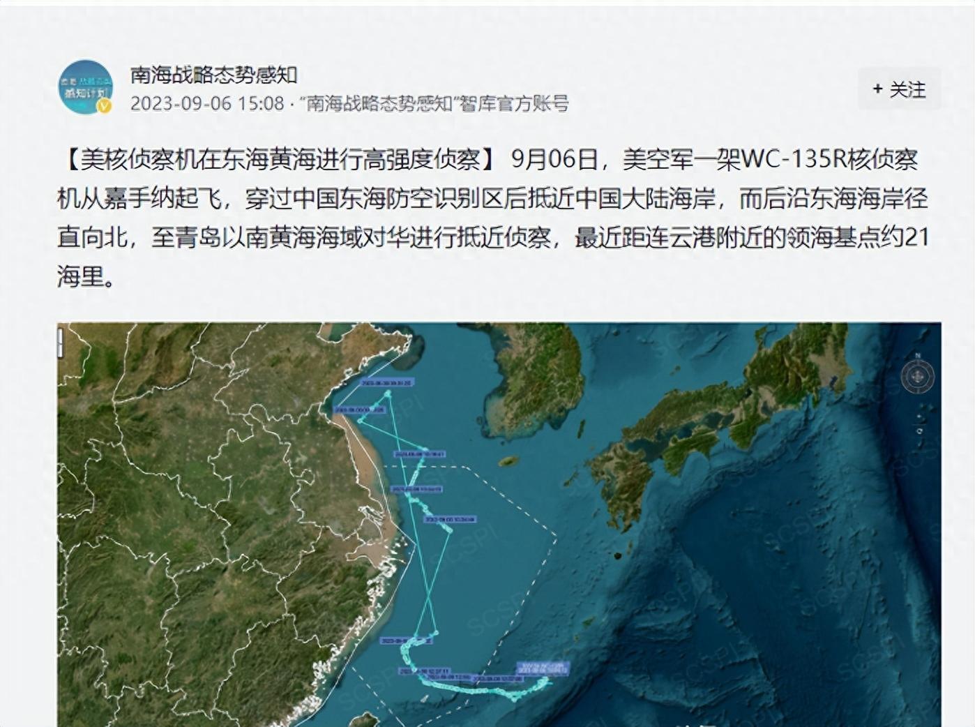 突发!美核侦察机在东海黄海高强度侦察,穿过东海防空识别区
