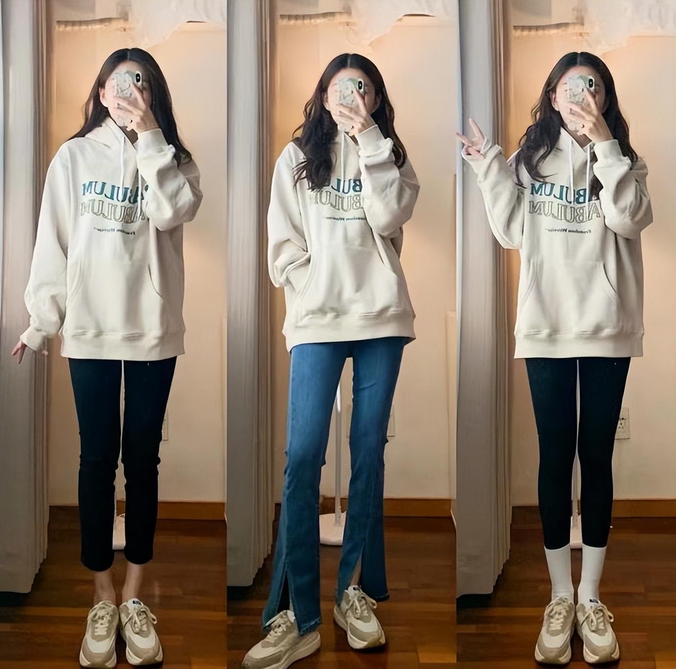 ◆打底裤:其实,对于卫衣这种上衣,与很多下装相配都好看的,如果你腿部线条和比例都是比较好的,可以选择打底裤来配,今年流行的鲨鱼裤和瑜伽裤都可以,上松下紧的组合,简直不要太显瘦了。