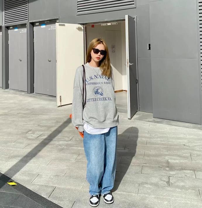 浅灰色的卫衣,作为经典色的其中之一,百搭性是不用质疑的,而且这个颜色也极其不挑肤色穿,所以,即便你是黄皮肤的女性们,也是可以hold住的,当然,也可以穿得很好看!在搭配上,内搭再叠穿一件白色t恤,稍微将t恤的下摆露出来一点,营造出层次感,选择牛仔宽松长裤和运动鞋来配,简单舒适的范就打造了。